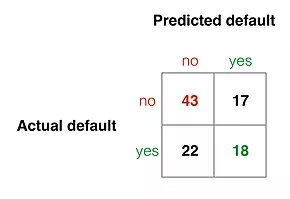 In the above example of 100 bank lending customers, the machine correctly predicted 43 customers would not default and that 18 customers would. So far so good.